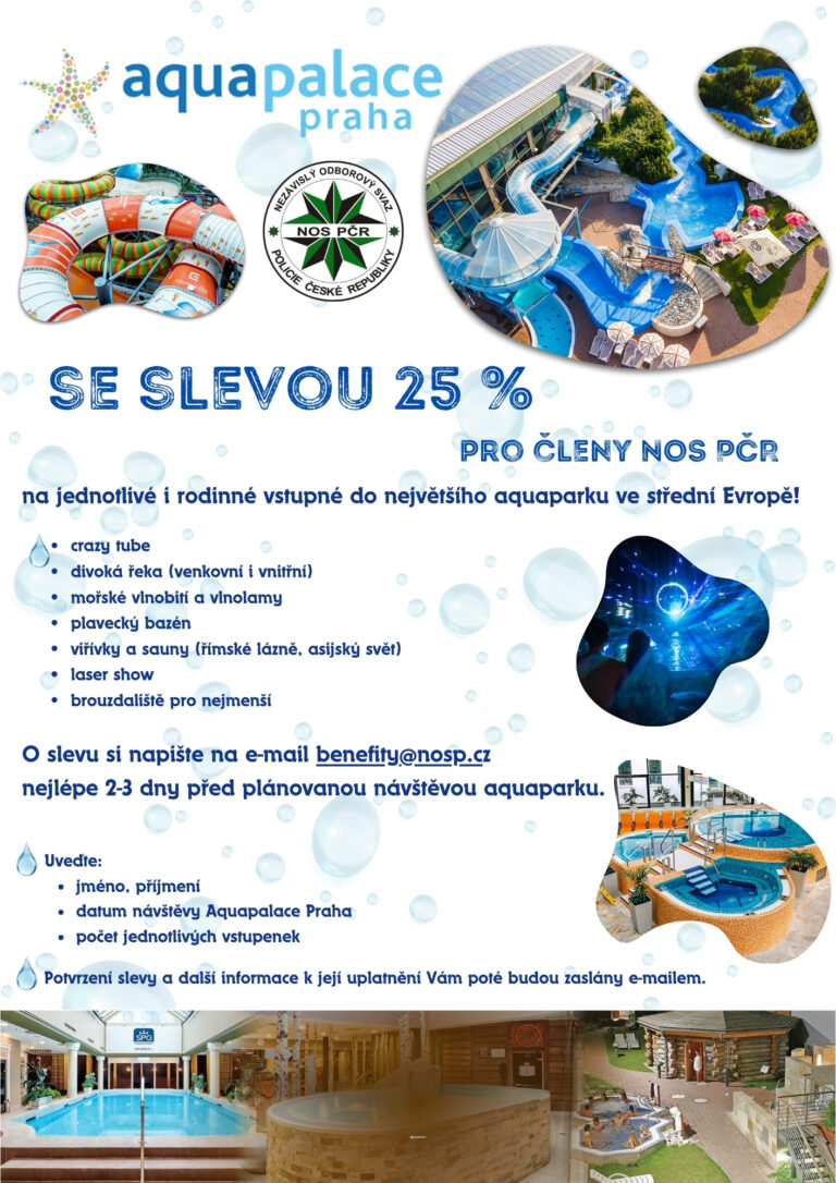 Členové a veteráni NOS PČR mají možnost využít 25% slevu na jednotlivé i rodinné vstupné do největšího aquaparku ve střední Evropě – AQUAPALACE PRAHA!