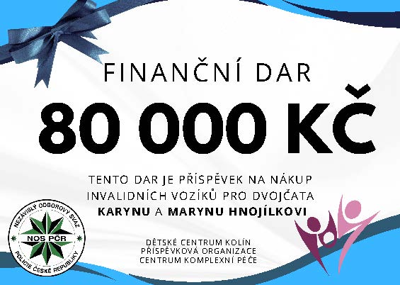 Částka ve výši 80.000,- Kč byla věnována dvojčátkům Karyně a Maryně, které bojují se svalovou dystrofií. Toto progresivní onemocnění způsobuje postupné oslabování svalstva, kvůli čemuž jsou dívky dnes již plně odkázány na invalidní vozíky. Finanční dar tak bude využit na pořízení nových invalidních vozíků, které rodině i dívkám výrazně usnadní náročnou logistiku při každodenním dojíždění. Sestry jsou klientkami Dětského centra Kolín, což je příspěvková organizace poskytující komplexní odbornou péči, rehabilitace a poradenství rodinám dětí se zdravotním postižením či závažným onemocněním.