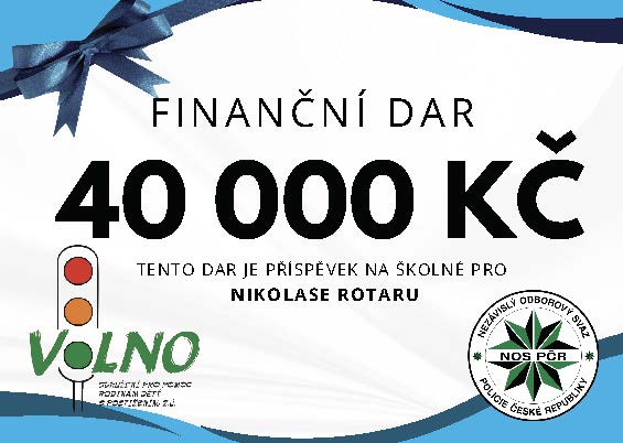 Dalších 40.000,- Kč putovalo pro devítiletého Nikolase na úhradu školného ve speciální škole, která je zcela klíčová pro jeho další rozvoj, socializaci a nácvik sebeobsluhy. Nikolas žije s atypickým autismem, je nemluvící a vyžaduje velmi specifický přístup a pevné rituály, aby zvládal stresové situace. Chlapec je v péči organizace Volno, sdružení pro pomoc rodinám dětí s postižením, z.ú., která se v Kolíně specializuje na všestrannou podporu rodin pečujících o děti s autismem a mentálním či kombinovaným postižením, zejména formou odlehčovacích služeb a odborného poradenství.