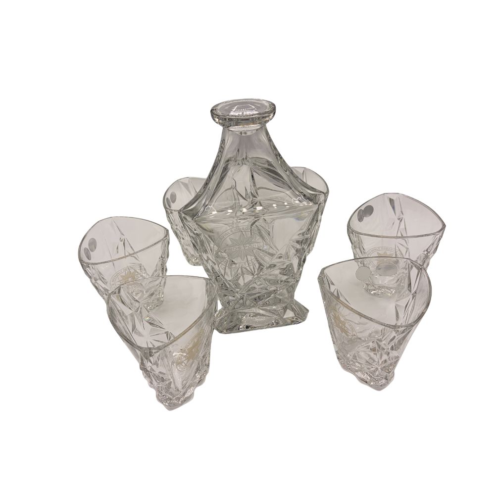 křišťálové sklo, karafa s uzávěrem + 6 whisky sklenek s logem NOS PČR,