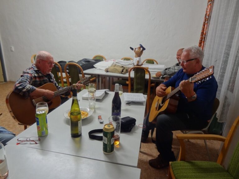 Dobrovolníci následně rozdělali na základně oheň, velké kusy dřeva hořely vydatně a špekáčky se v tom žáru opékaly rychle. Všichni jsme se nasytili, celý večer bylo pořád co pít, akorát „ne alka“ bylo nějak pomálu, i když voda z kohoutku byla také dobrá. A už bez přemlouvání hráli na kytary Karel Vacek a Pavel Žákovec za pěveckého doprovodu ostatních sboristů. V závěru večera ještě odjeli zpátky do Ostravy David a Ivana se sudem od piva, který jsme vyprázdnili do poslední kapky.
